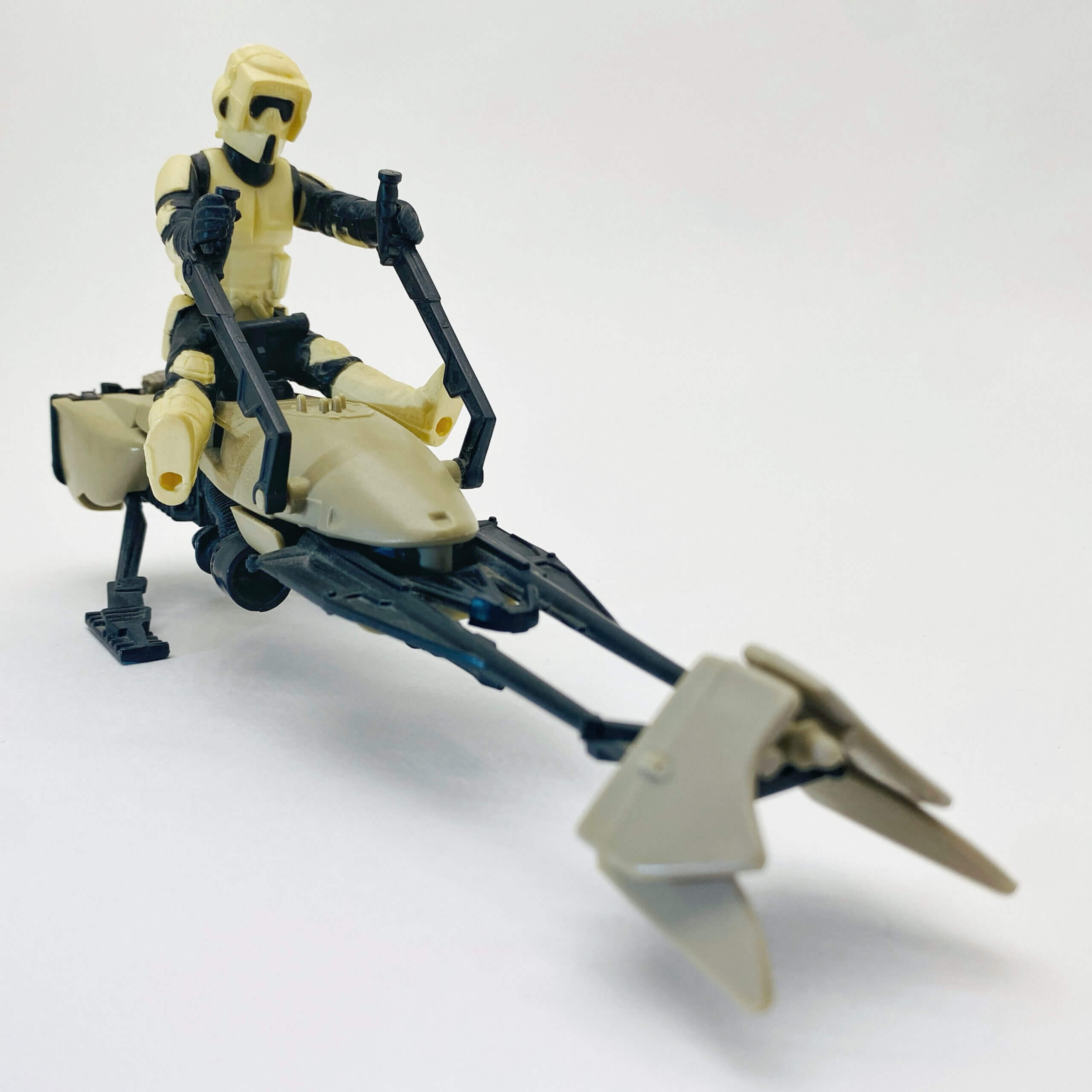 Cela doit être le jouet Star Wars avec lequel je me suis le plus amusé. Même si je ne le fait plus « sauter » de crainte que le temps l’ait trop fragilisé pour supporter le choc, j’ai la chance de l’avoir conservé entier et fonctionnel. J’aime toujours autant le design du personnage et de sa « moto » et, coup de bol, ils ne prennent pas trop de place dans la vitrine !